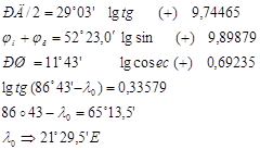 Определяем долготу точки пересечения ортодромии с экватором по формуле: