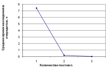 Рисунок 2.5 Зависимость среднего времени нахождения а/м в очереди от общего количества постов.
