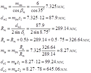 В конических передачах с и>1 с целью выравнивания удельных скольжений и, следовательно, для повышения сопротивления заеданию шестерню выполняют с положительным радиальным смещением (х1>0), а колесо с равным по абсолютному значению отрицательным радиальным смещением (х2=-х1). Для передачи с круговыми зубьями: