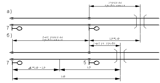 оказывается больше, чем расстояние до этого светофора. Участок приближения в этом случае устраивают между светофорами 5 и 7 (рис. 2.1 б). Теперь фактическая длина участка приближения исчисляется от светофора 7 и образуются два участка приближения: первый от переезда до светофора5 и второй — между светофорами 5 и 7. В этом случае извещение на закрытие переезда будет подаваться на два участка приближения.Рисунок 2.1 Схема для определения участков приближения перед переездом
